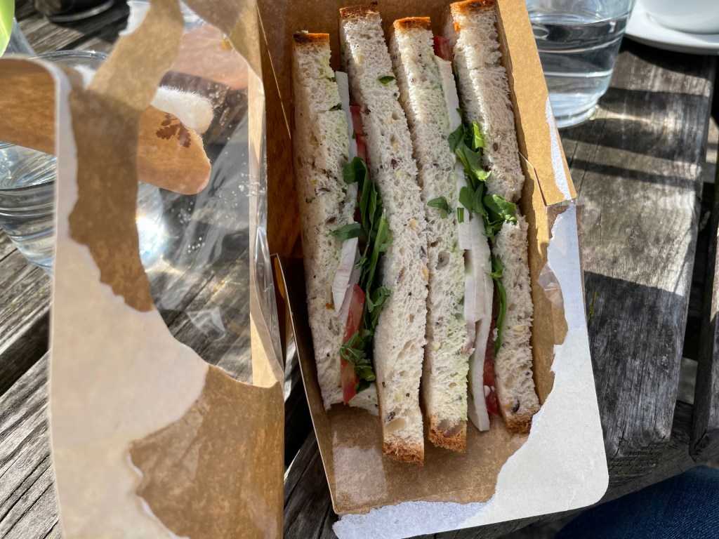 13:01 Gluten-free sandwich for lunch, at this cafĆ© place near the beach. Chicken and pesto. I’m gettingĀ Ā a bit chilly now! The sandwich was okay, wish I could have a pasty though, but there weren’t any gluten-free pasties 😦