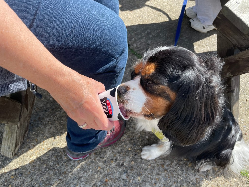 13:28 Before I eat my ice cream, Merlin is having his! A special ice cream for dogs. So cute!  He loves it!