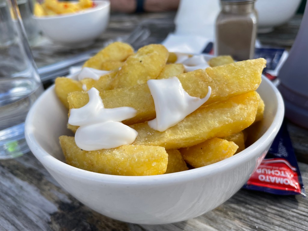 15:08 We finished the walk, now sitting down at a fish and chips, I only ordered some chips because I can only have gluten-free battered fish 😦  Merlin was a bit of a bad boy earlier on because he rolled in a dead bird! So he is getting a bath when we get back!