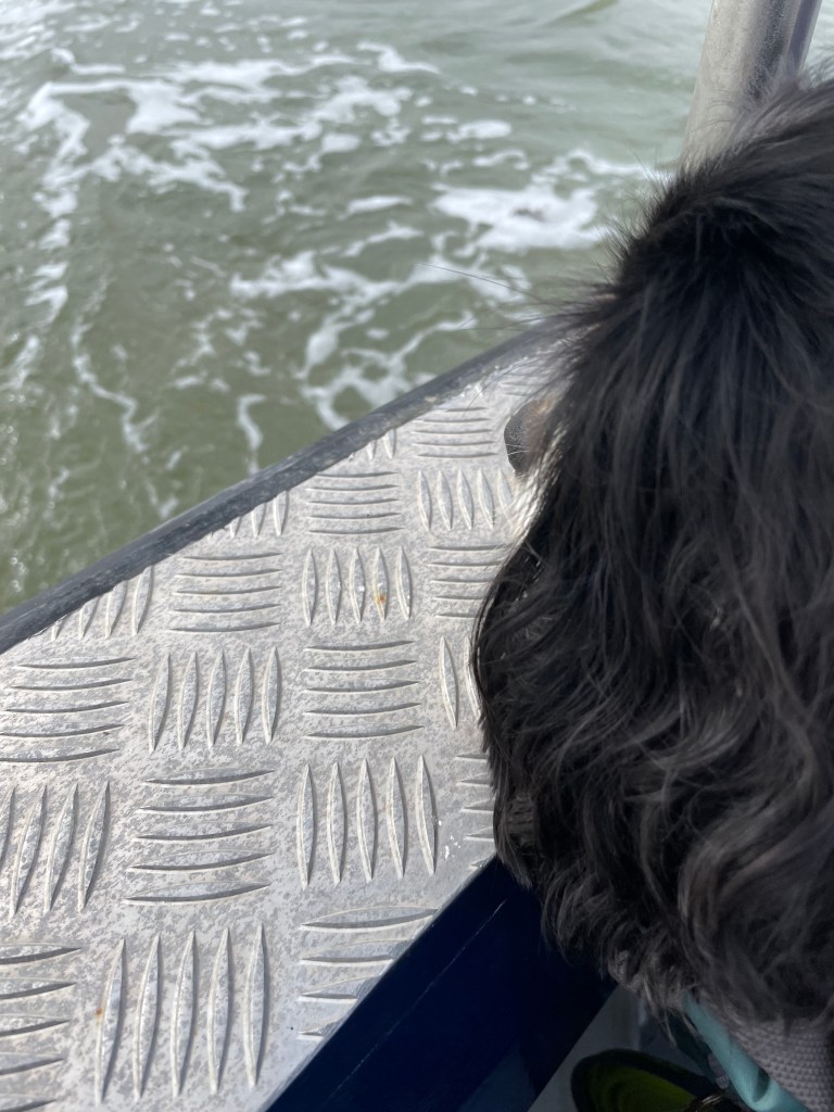 Near the end of the boat trip, Merlin started to become more confident and was fascinated by the moving water at the back!